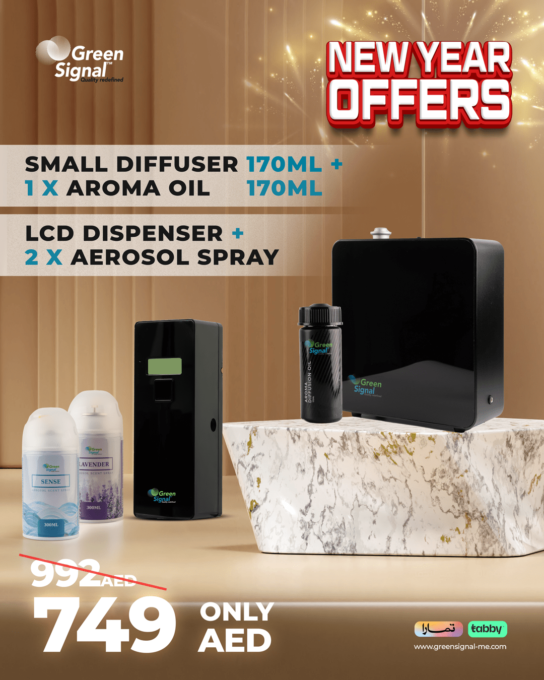 Premium Small diffuser with oil, dispenser, and two aerosol air fresheners, all customizable.
